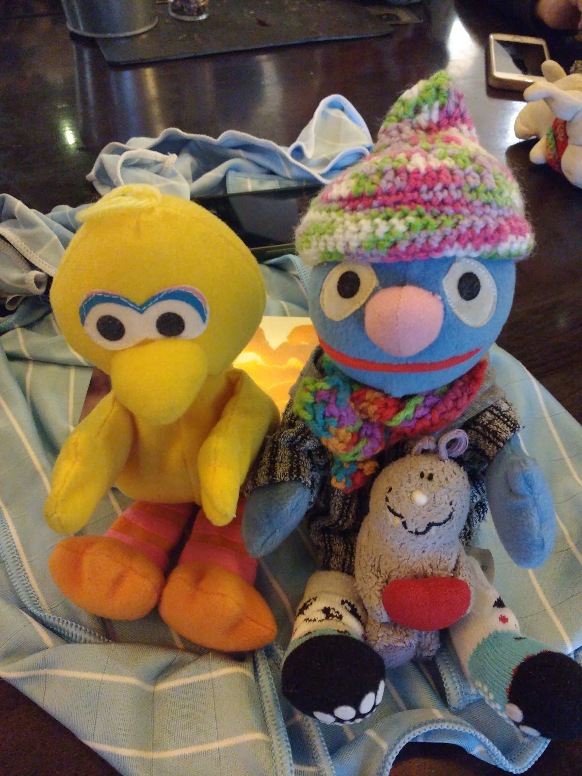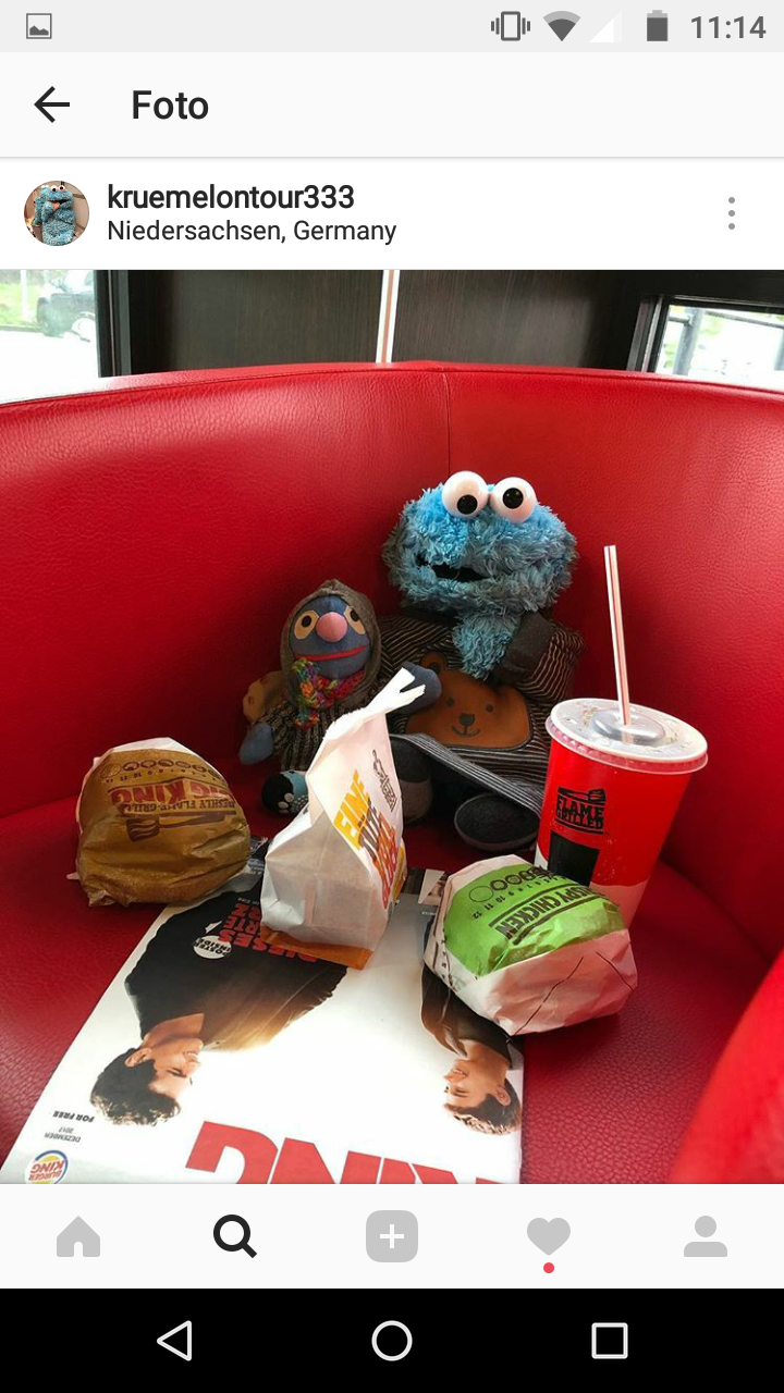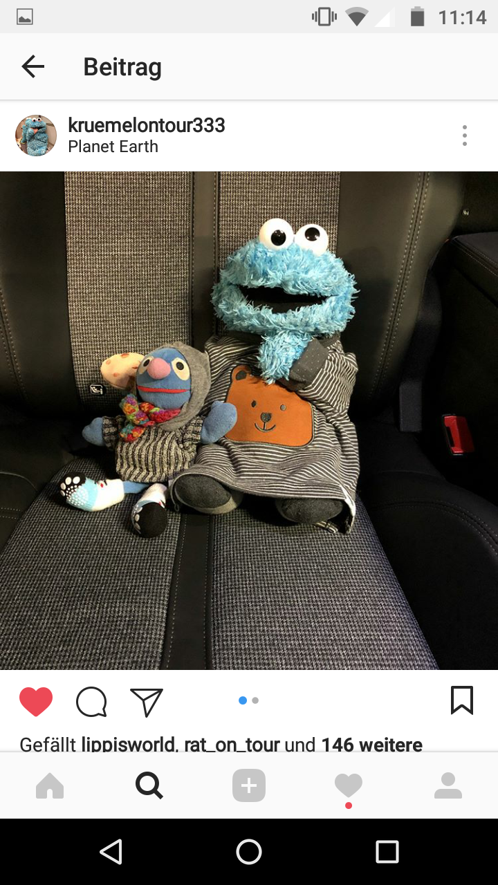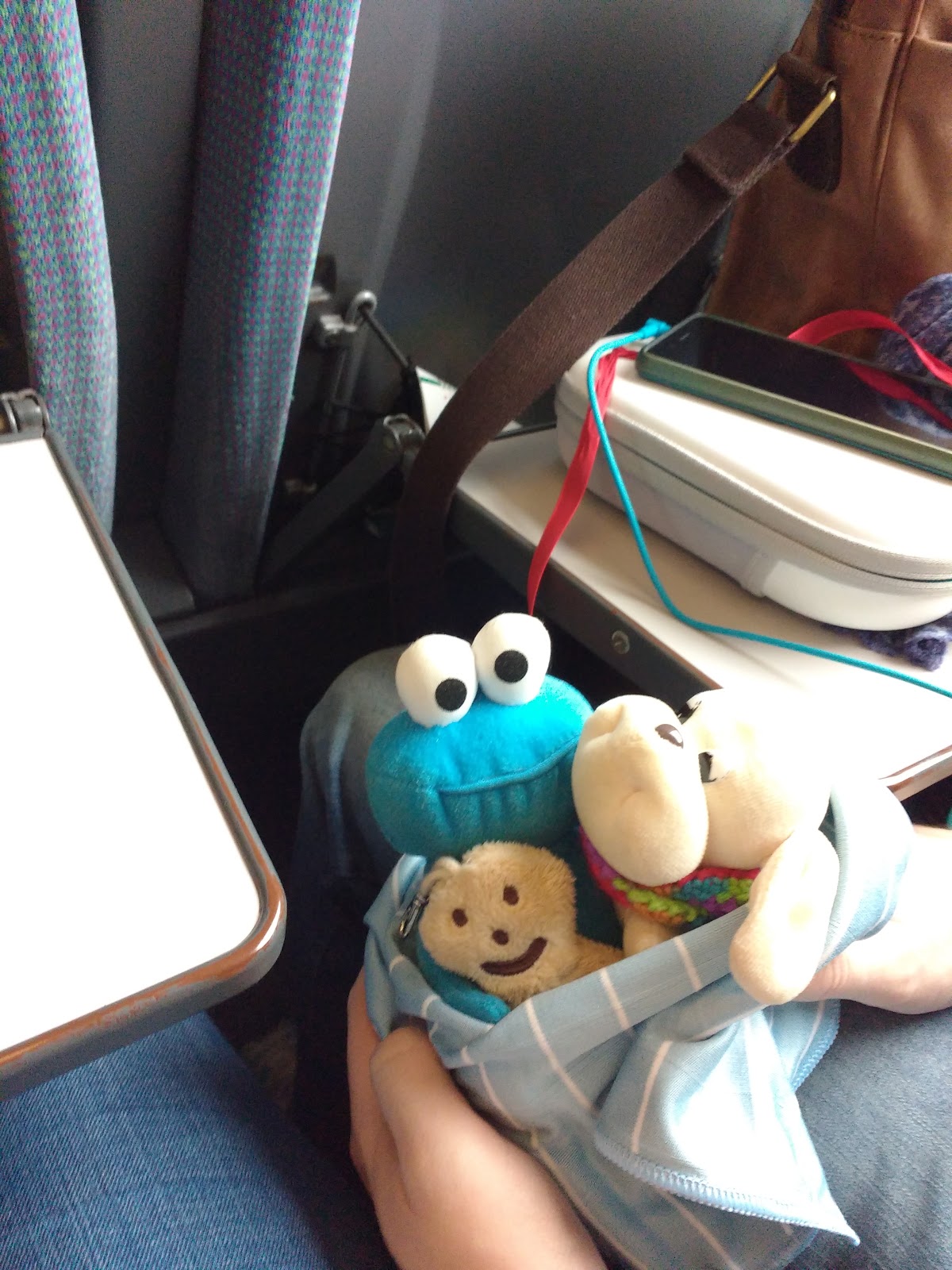 Aber nicht nur Willy wiederzusehen, war ein Highlight an diesem Tag, sondern auch das Plüschi-Treffen an sich. Wir haben uns zwar schon mal mit einem Krümelmonster getroffen (in Gladbach am Stadion, was auch super toll war), aber das Treffen damals war leider nur sehr kurz. Diesmal war mehr Zeit eingeplant und es waren auch richtig viele Plüschis dabei. Unsere Abordnung bestand aus mir, Bibo und Kuschel, Knuffi, (unserem) Krümel und Ginger. Auf dem Weg nach Frankfurt haben wir versucht, uns noch ein bisschen zu erholen, was angesichts der Aufregung gar nicht so leicht war.