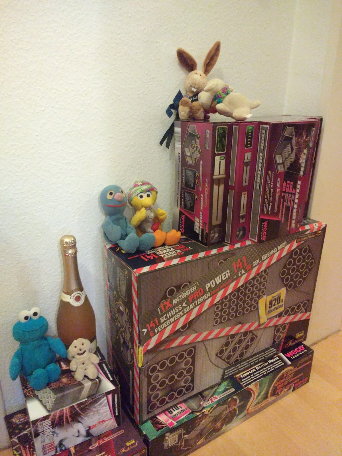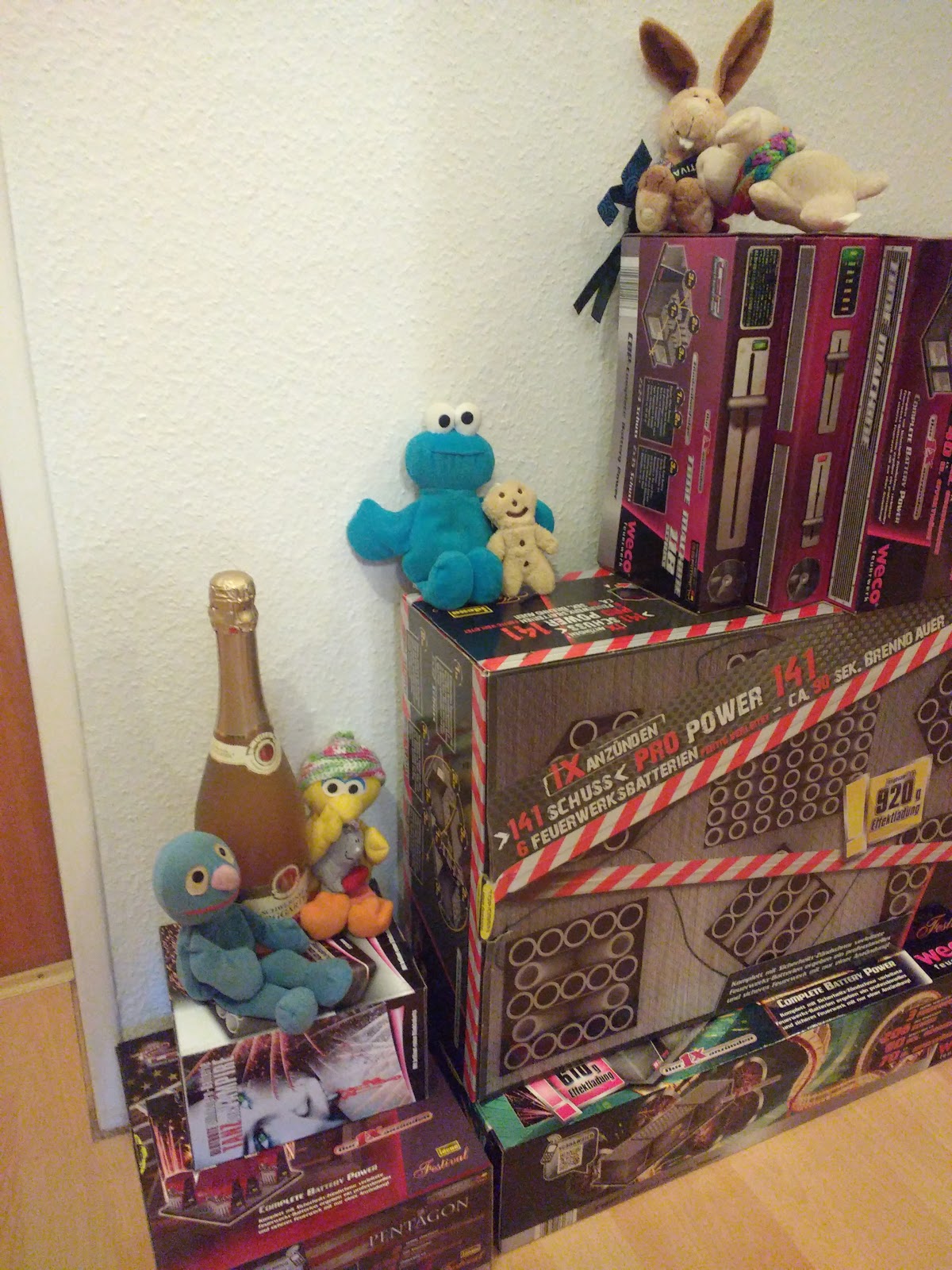 Als sie zurückkamen, wurde das Feuerwerk aus dem Auto geholt und in die Wohnung getragen. Wir haben das Ganze mal genauer inspiziert, um zu wissen, ob es auch was taugt.
