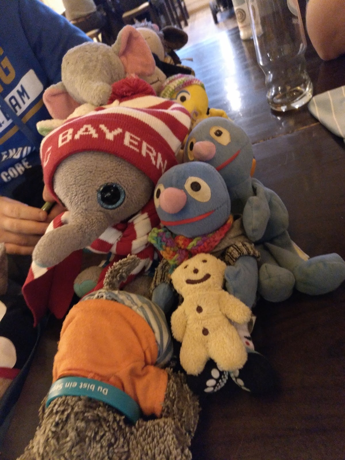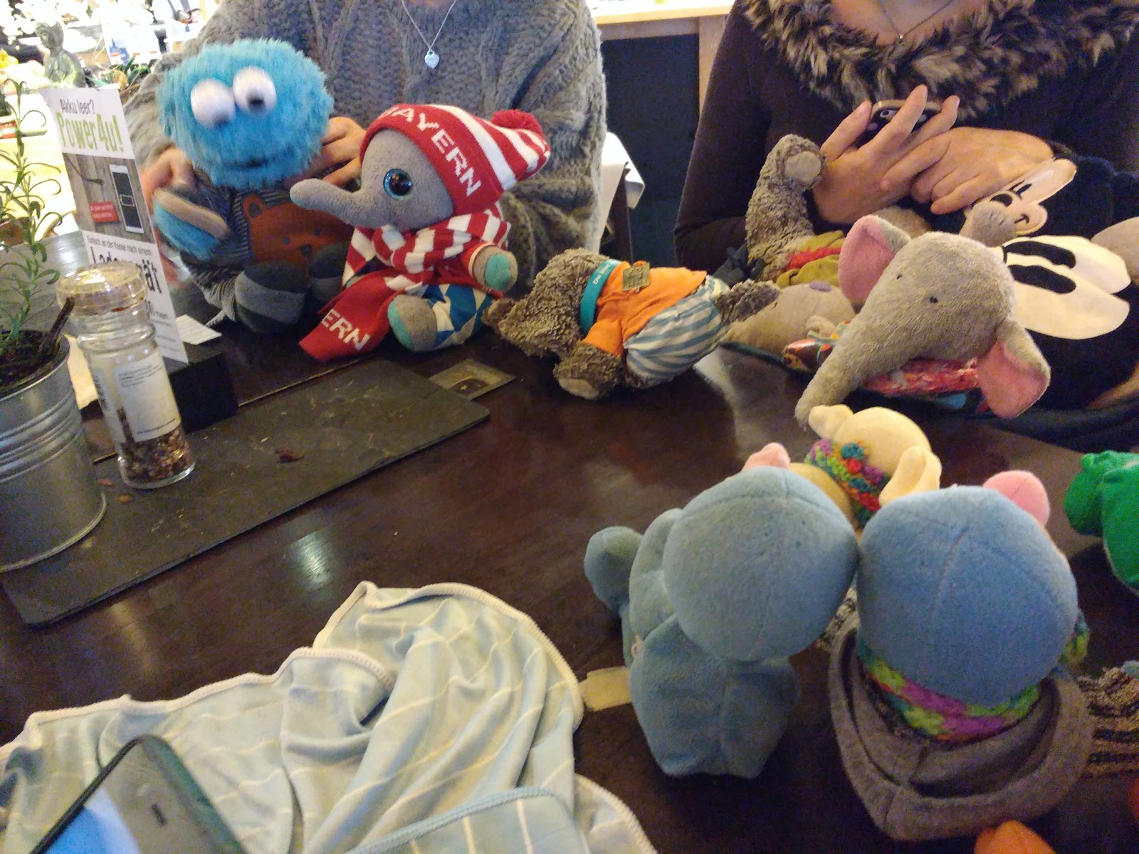 Schließlich haben wir uns also am Frankfurter Bahnhof getroffen, zunächst mit Krümels Familie, die Willy als Erkennungsmerkmal hochgehalten haben. Ein paar Schritte weiter trafen wir dann auf die Fantenbande, eine sehr große Gruppe überwiegend aus Elefanten, aber nicht nur. Lämmlein Molly, zwei Schäfchen und ein paar Bären waren auch dabei. Gemeinsam sind wir in das Restaurant vom Kaufhof gegangen und haben uns einen großen Tisch gesucht, wo wir alle Platz hatten. Die Menschen haben erstmal etwas gegessen und getrunken, während wir Plüschis schon mal eine Vorstellungs- und Kennenlernrunde gemacht haben. Dabei wurden schnell Sympathien festgestellt und Freundschaften geknüpft.