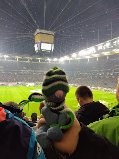 Um kurz vor 17 Uhr ging es jedenfalls am Freitag mit dem Zug los nach Frankfurt. In Bahnhofsnähe wurde noch ein Abendessen vertilgt, dann wurde Bier gekauft und wir sind mit der Straßenbahn zum Stadion gefahren. Dort gab es mal wieder von Ordnern organisiertes Chaos, sodass wir den Anpfiff verpasst haben. Den größten Teil des Spiels haben wir allerdings gesehen und der war eher nicht so toll. Ich habe versucht, mir die Mütze übers Gesicht zu ziehen, damit ich es nicht sehen muss, aber irgendwie ist das auch doof, wenn man nicht sieht, warum alle schimpfen.