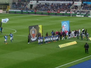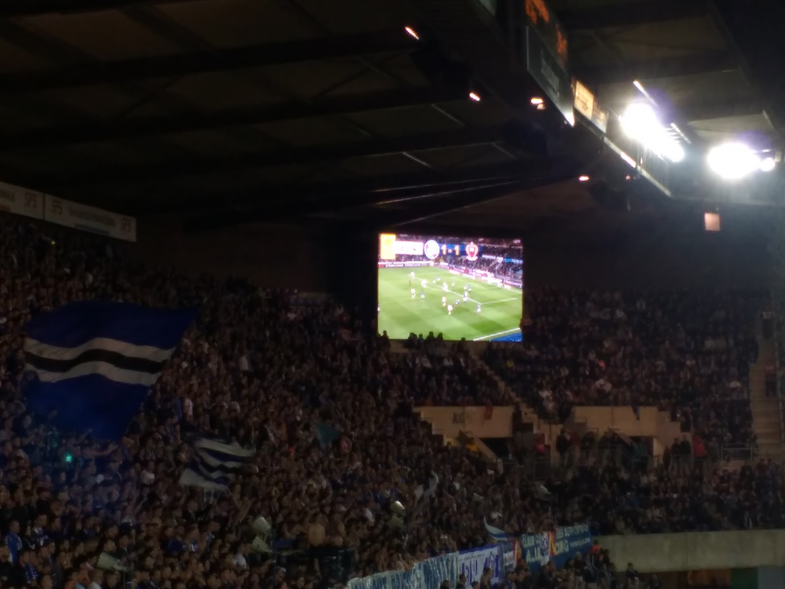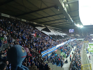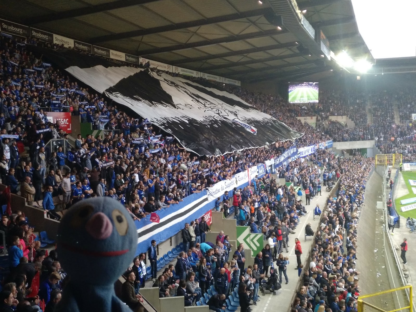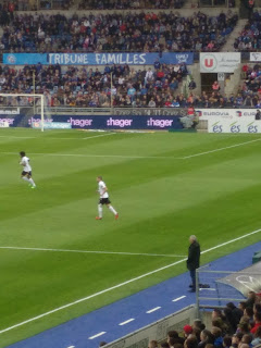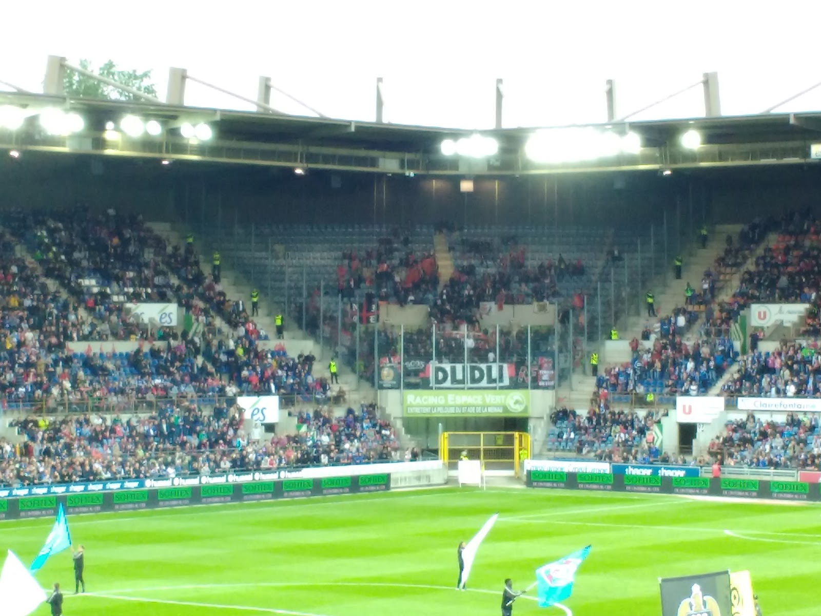 Diese Plätze waren auf der Haupttribüne, recht nah an der Heimkurve, wo die ganze Zeit ordentlich Stimmung gemacht wurde. Mir hat natürlich am besten der \“Allez les bleu\“-Gesang gefallen. Gästefans gab es nicht so arg viele und von dort kam auch keine Stimmung, aber wir hatten ja mit unseren blauen Freunden auch genug Action. Und natürlich haben wir auch Lucien gesehen 😉