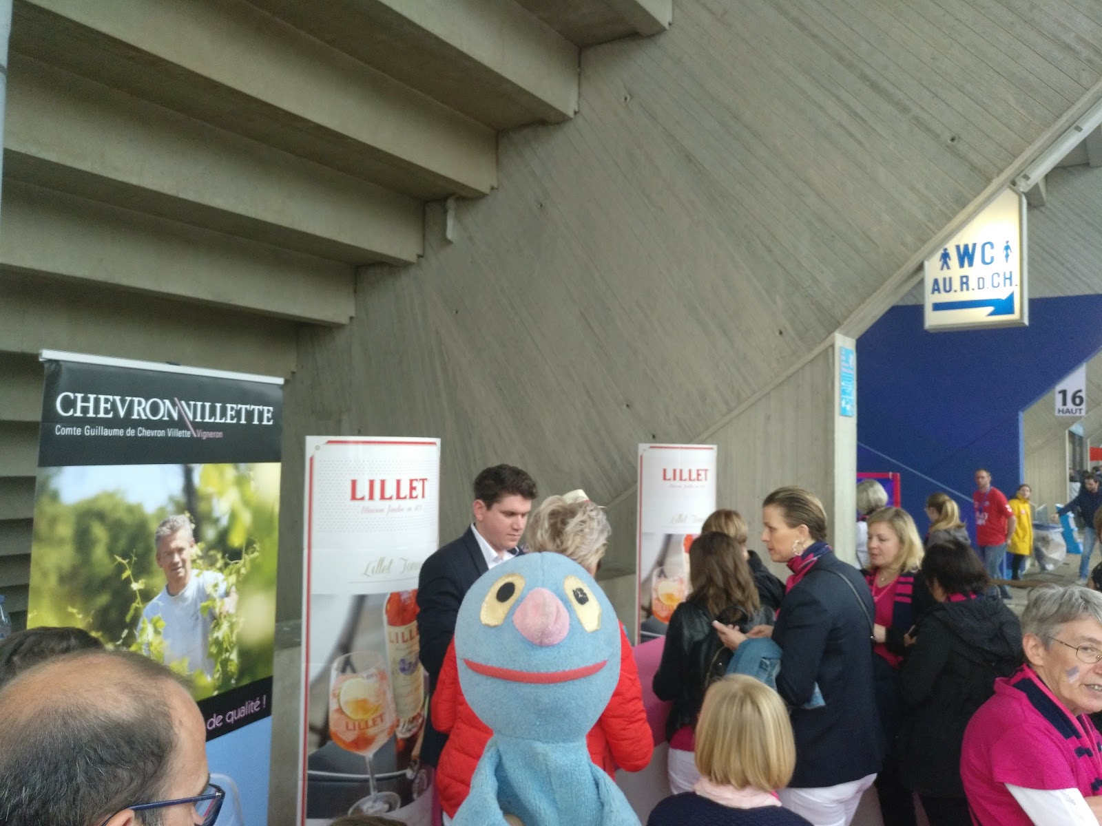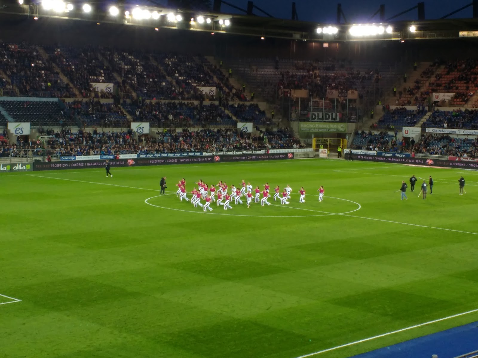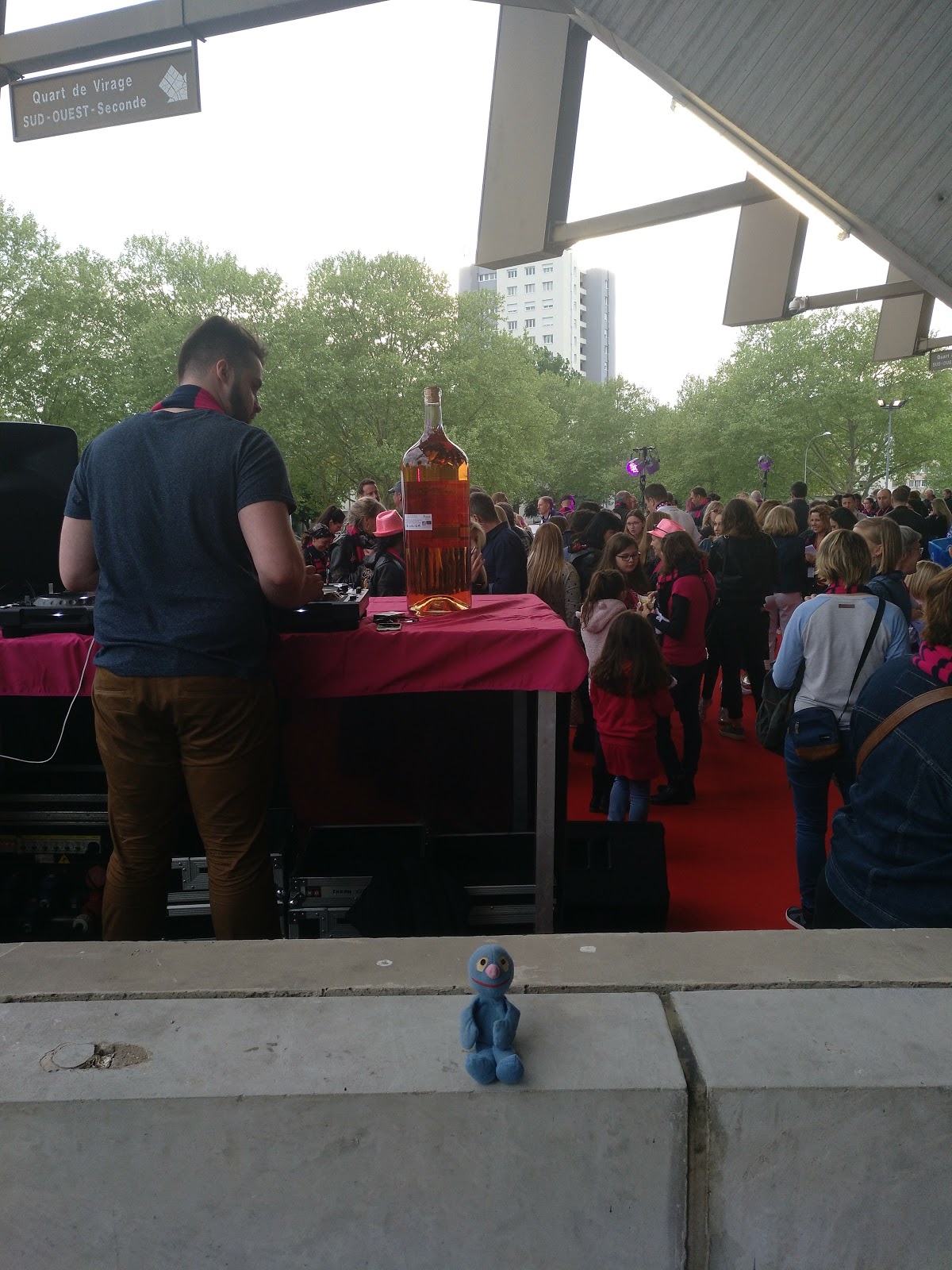 Durch die Einlasskontrolle kamen wir recht zügig hindurch und haben uns erstmal ein wenig umgesehen. Es gab Essens- und Getränkestände, einen Stand mit Makeup und Nagellack, den wir recht komisch fanden und einen Bereich mit DJ und einer riesigen Weinflasche. Dazu waren alle recht entspannt. Da Straßburg gerade recht weit unten in der Tabelle steht und Nizza recht weit oben, rechneten wir mit einem Spiel, bei dem beide Mannschaften möglichst gewinnen wollen würden.
