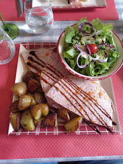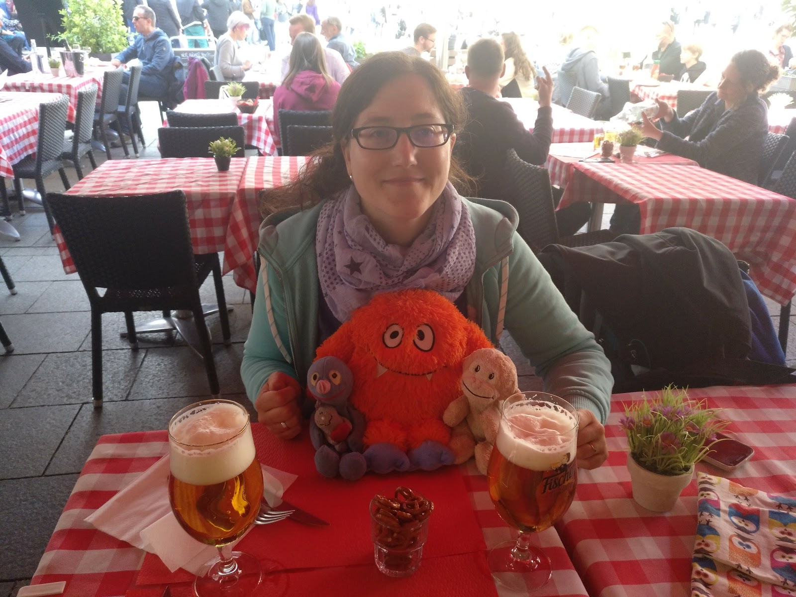 Wir liefen in die Innenstadt, besorgten zuerst bei einem Supermarkt etwas zu trinken und natürlich ein paar Kekse für den Krümel. Danach suchten wir uns ein nettes Lokal, wo wir draußen sitzen und Schatzi-Moppel etwas essen und trinken konnten. Es wurde natürlich direkt das französische Bier getestet und für gut befunden, auch das Essen war ganz hervorragend.