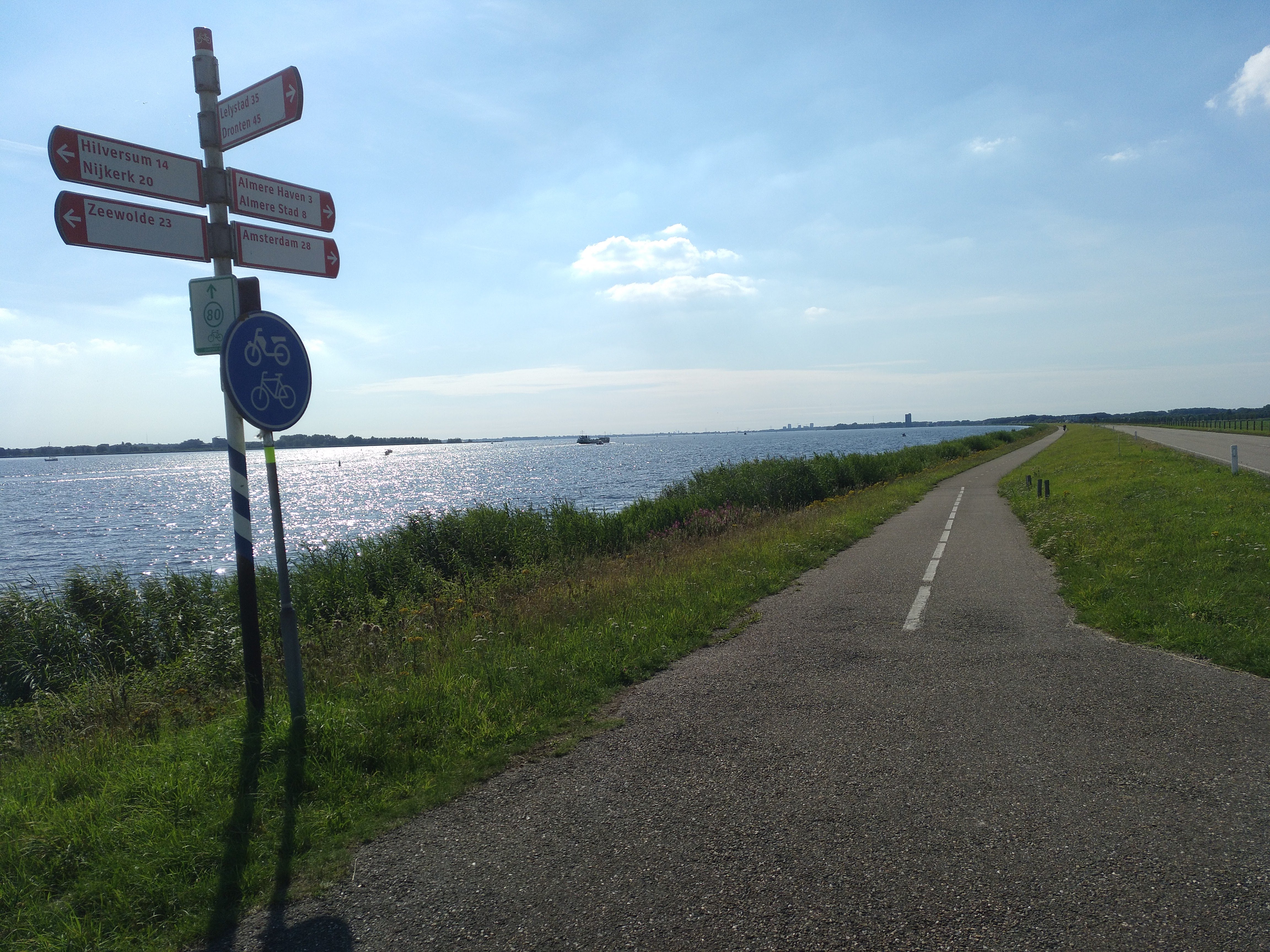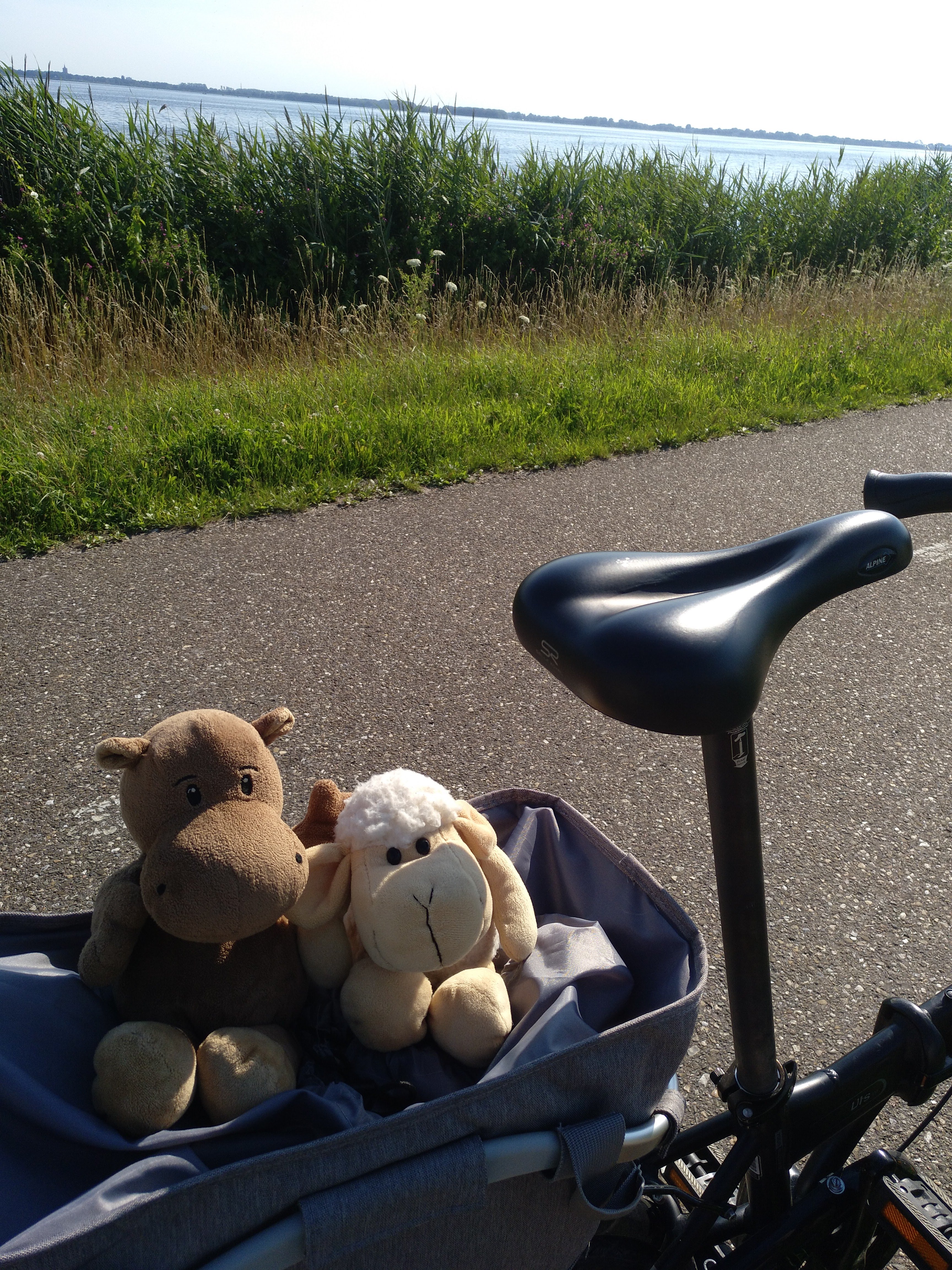 Der zweite Teil der Strecke zog sich irgendwie. Zunächst überquerten wir die Stichtse Brug, die zwischen Gooimeer und Emmeer verläuft, um dann in einem Bogen zum Wasser zurückfahren. Ab hier mussten Schatzi-Moppel einige Kilometer gegen den Gegenwind anstrampeln. Es war zwar eine wirklich hübsche Strecke, um langsam vor sich hin zu radeln, aber man merkte schon, dass echt die Luft raus war.