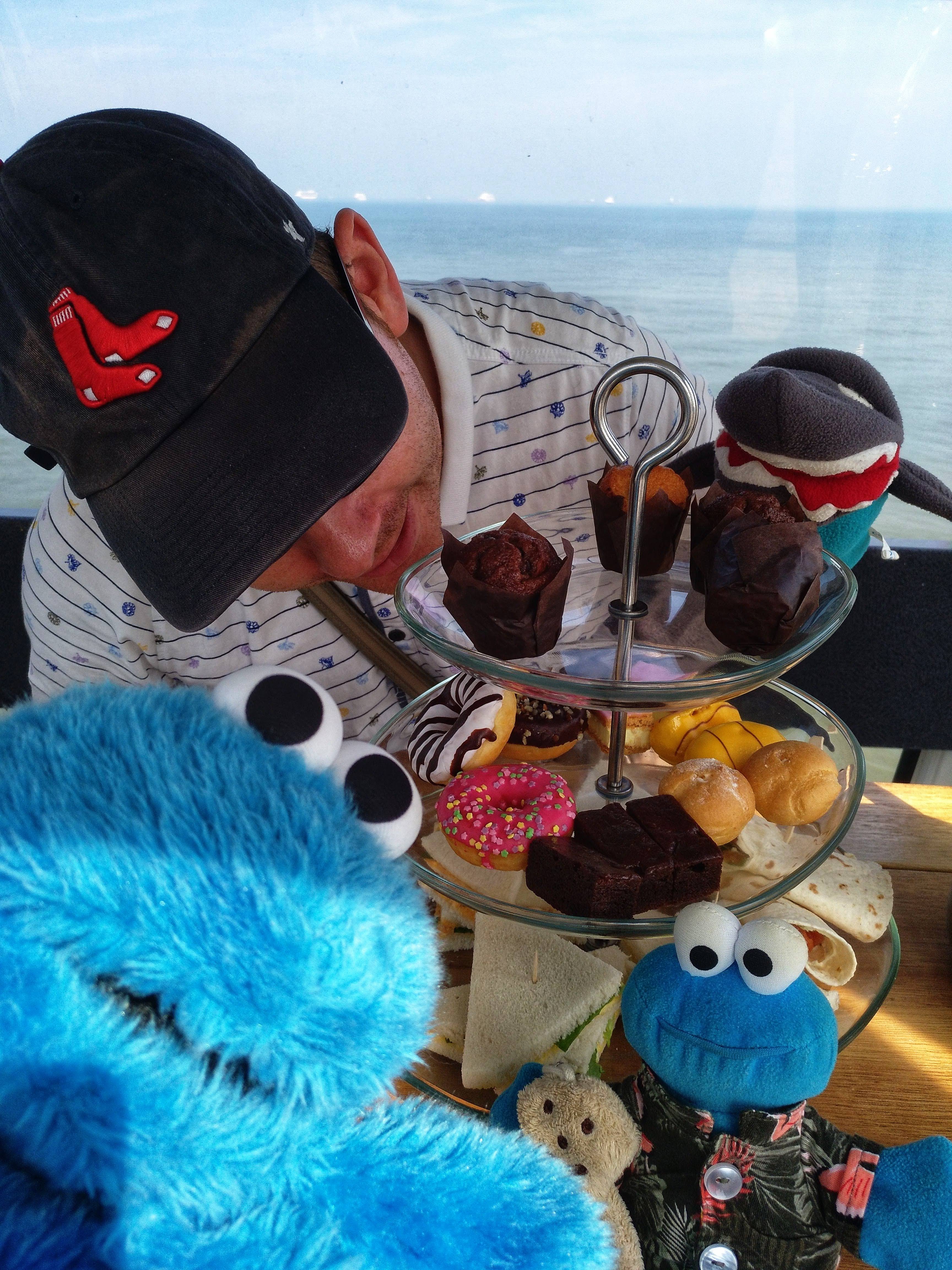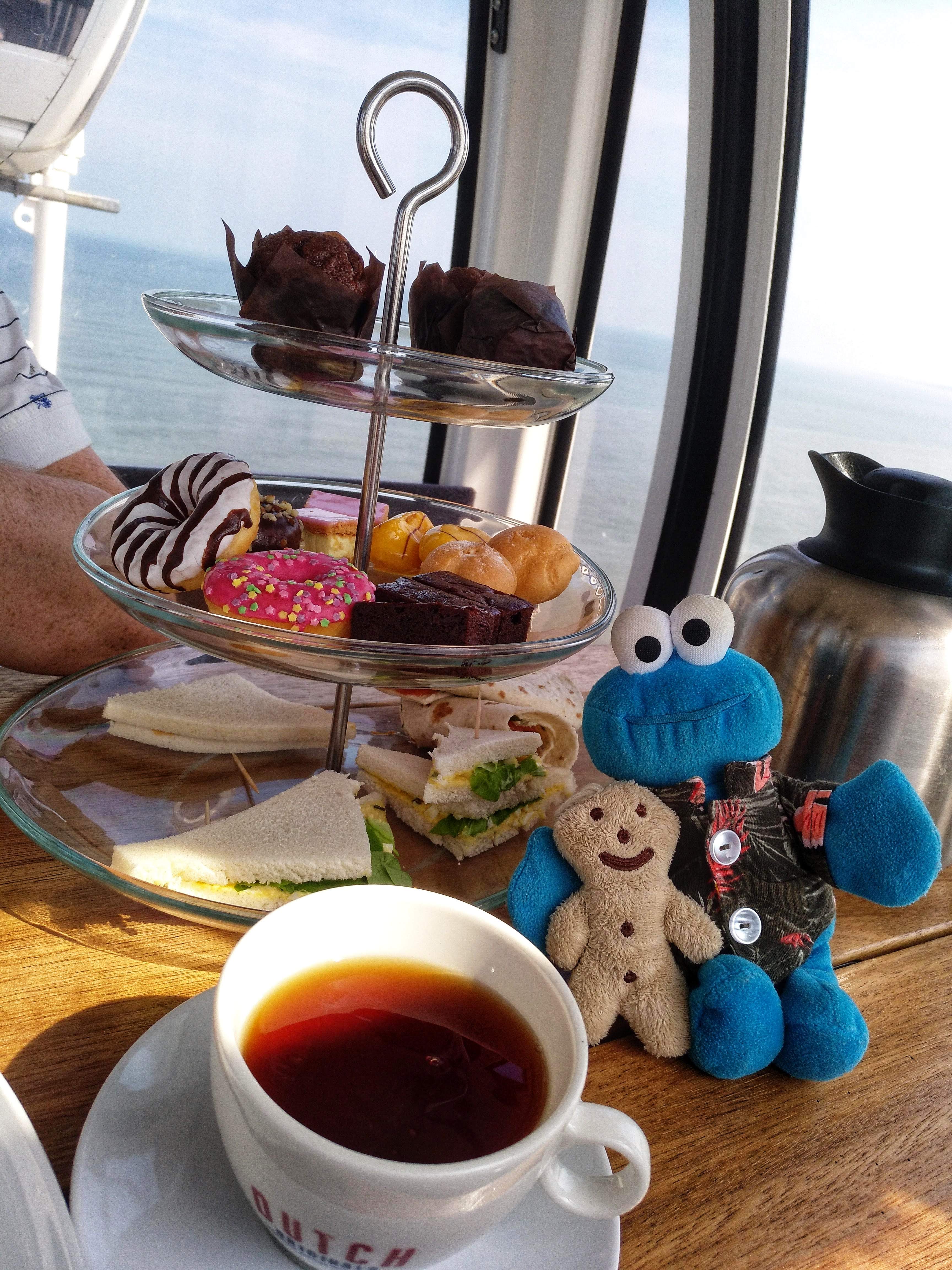 Nach etwa einer Viertelstunde wurde uns Tee und eine Etagere mit herzhaften und süßen Snacks hereingereicht und nun kamen endlich die Krümelmonster heraus und halfen fleißig mit, alles aufzumampfen.