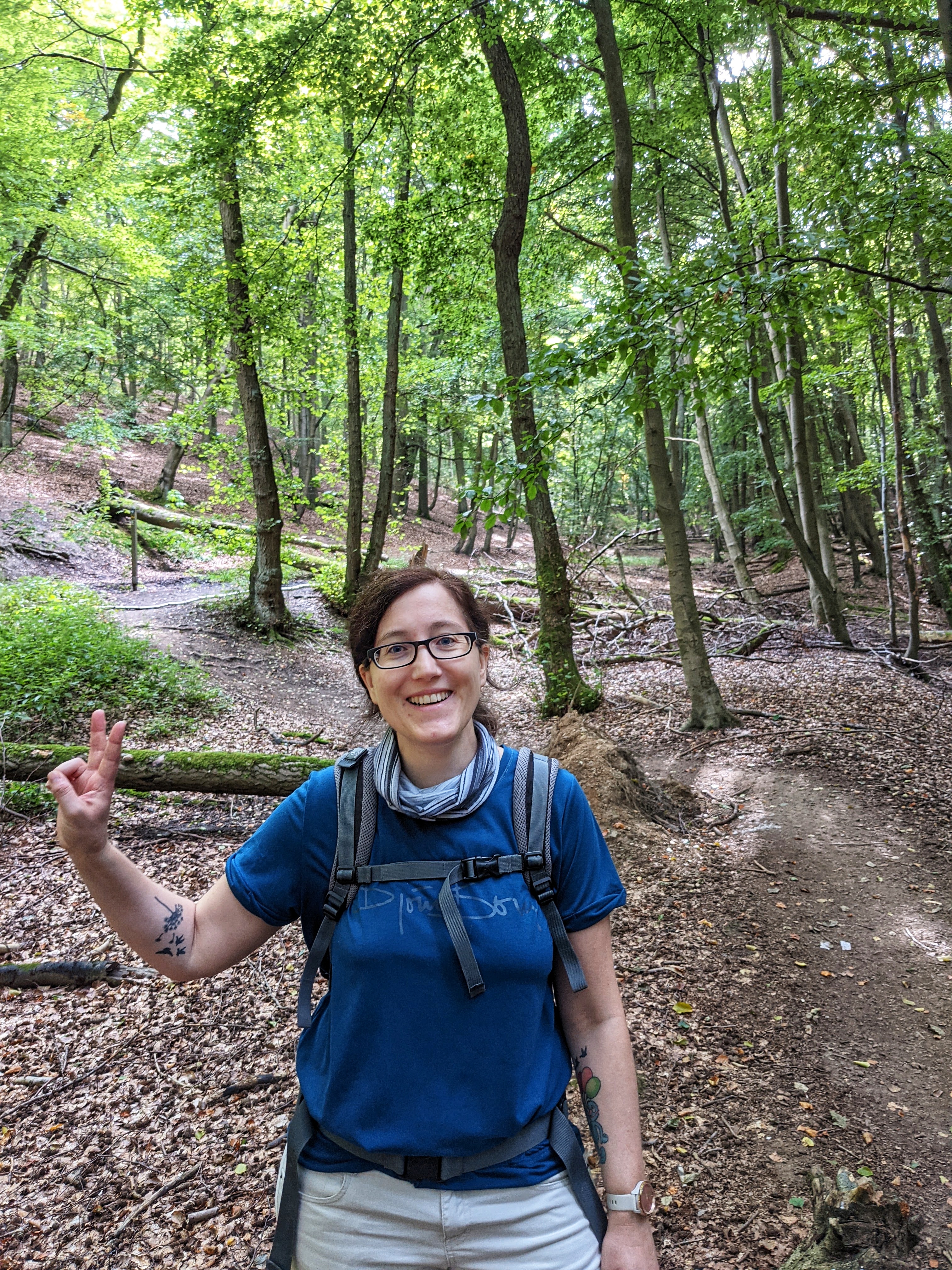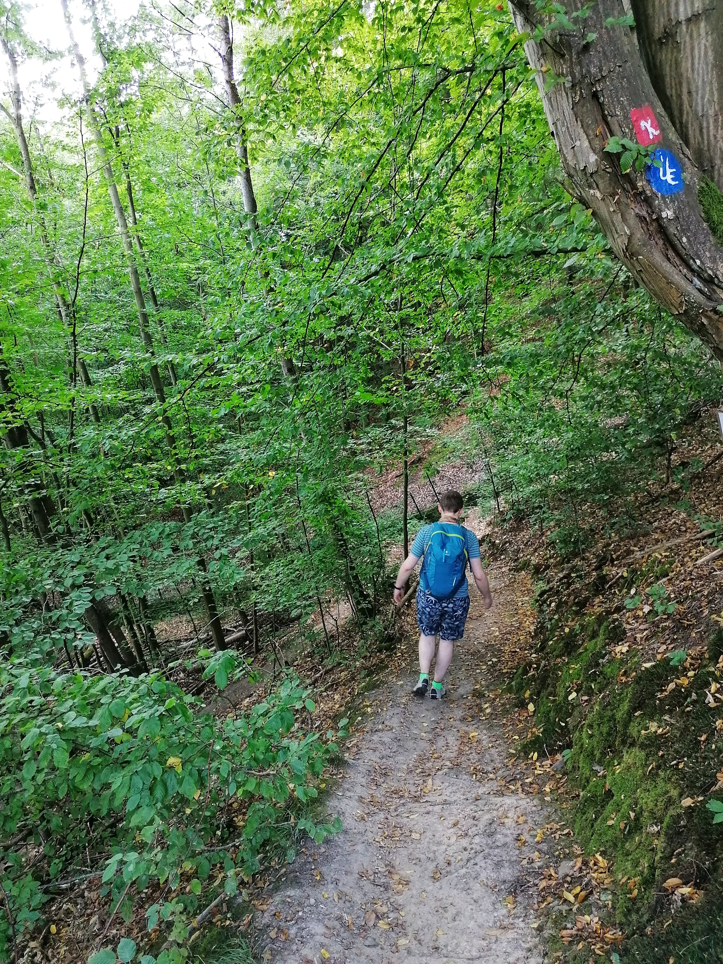 In Bringhausen startete dann unsere Wanderung. Zunächst mussten wir einen Einstieg in den Urwaldsteig finden, der uns nach Edertal-Hemfurth führen sollte. Die ausgesuchte Etappe des Wanderwegs war abwechslungsreich, aber auch recht anstrengend, da man immer wieder über Bäume klettern oder unebene Passagen gehen musste.