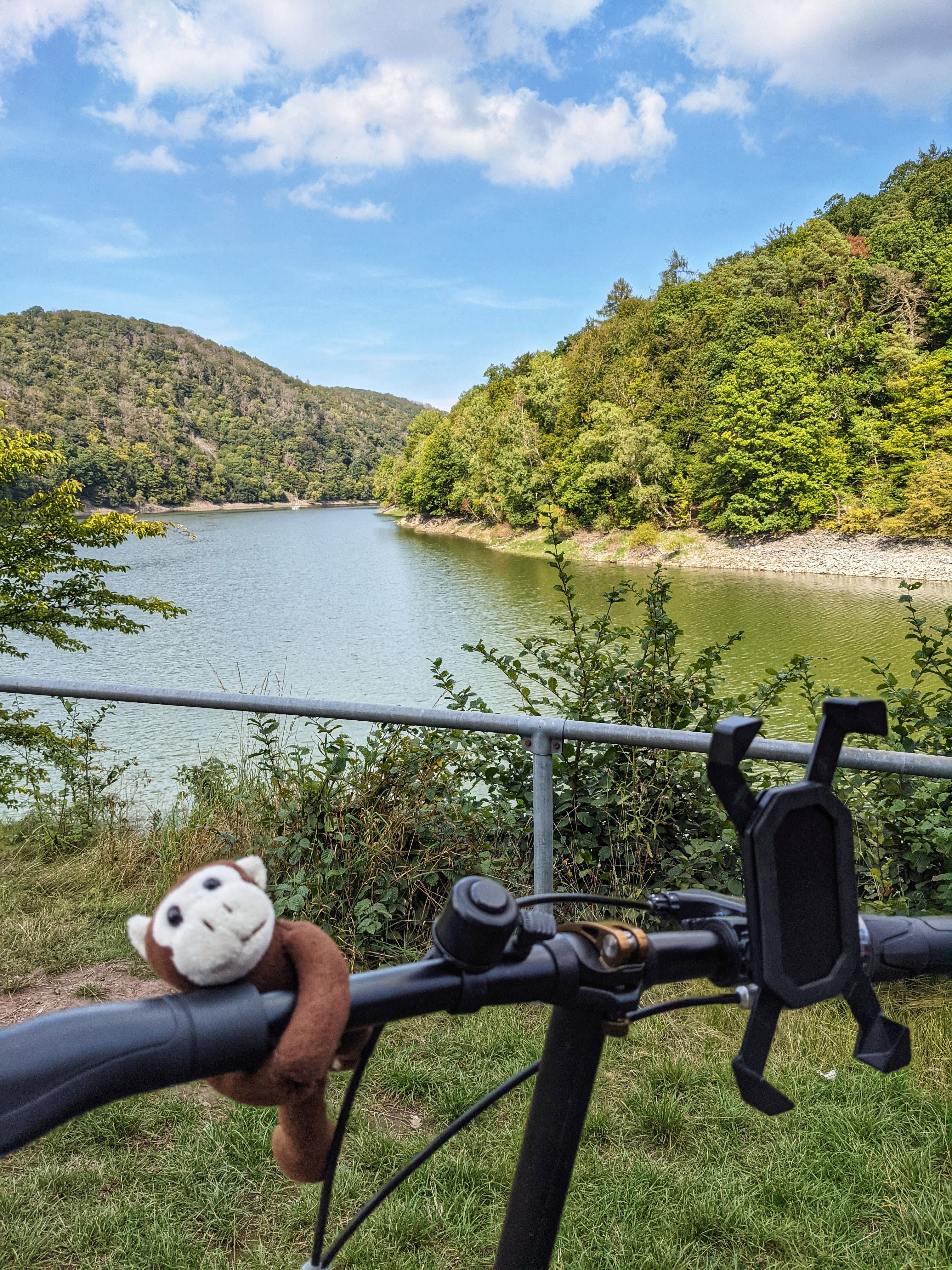 Wir fuhren zunächst von Waldeck ins Tal, wo wir das Auto parkten und die Falträder sattelten. Danach ging es los am See entlang Richtung Talsperre.