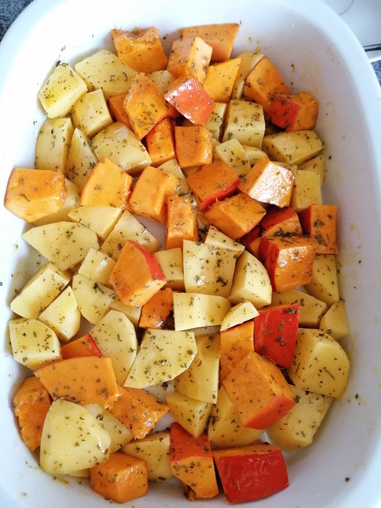 - Auflaufform fetten, Kartoffeln und Kürbiswürfel verteilen