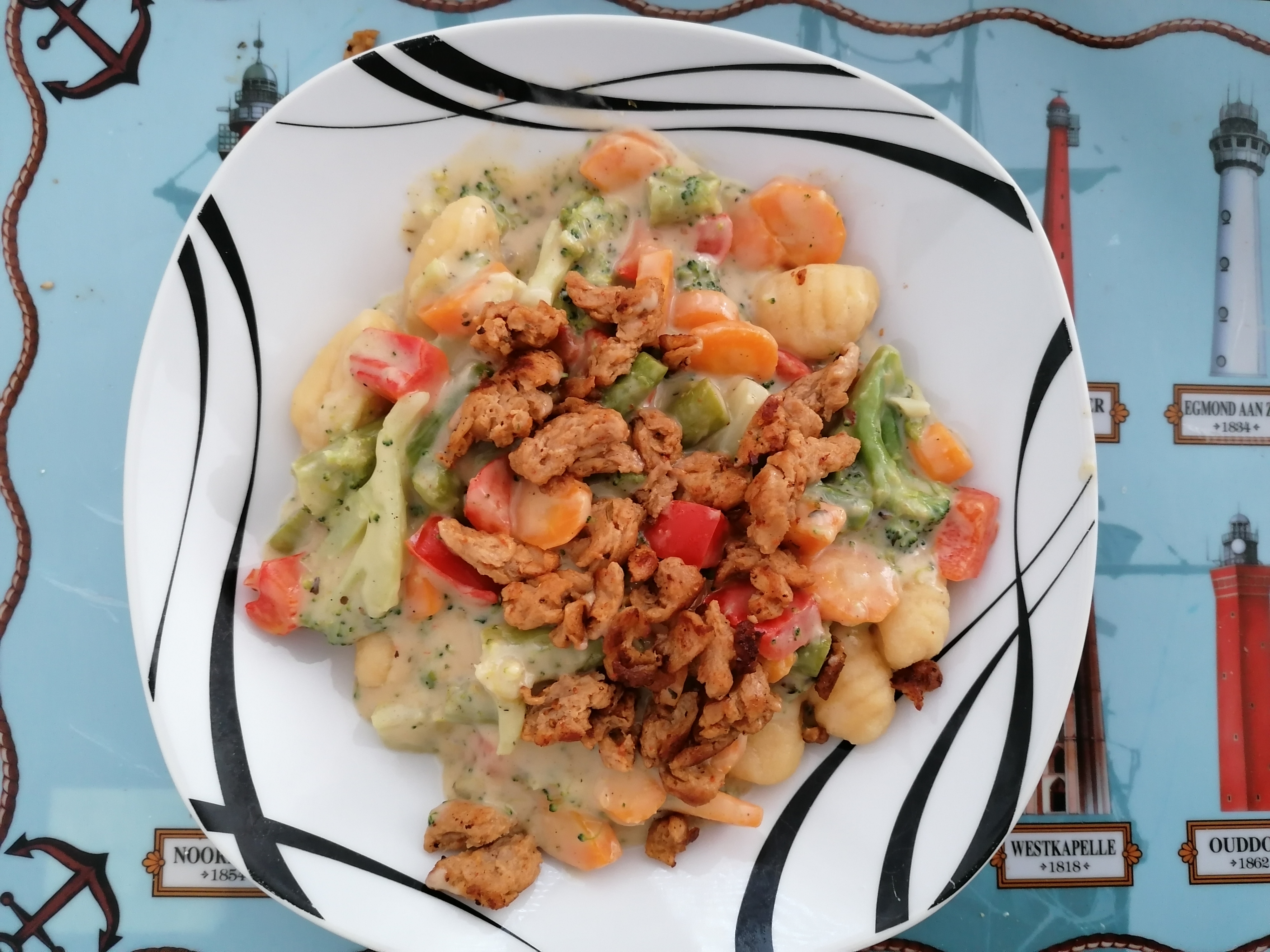 - Gnocchi abgießen, auf 2 Teller verteilen und die Gemüsesoße drüber geben