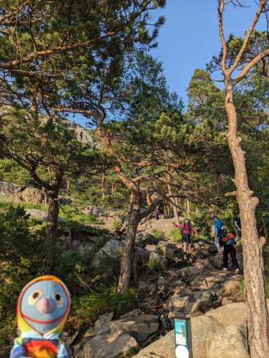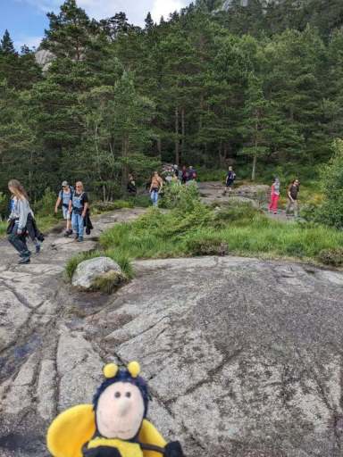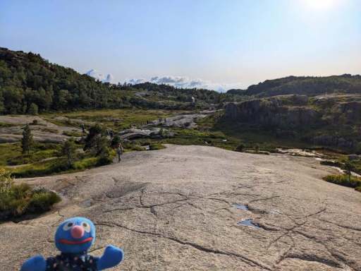 Schnell wurde alles ausgeladen und in die Ferienwohnung getragen, dann wurden die Wandersachen geschnappt und es ging wieder los. Nach etwa einer Dreiviertelstunde Autofahrt u.a. durch den längsten und tiefsten Unterwassertunnel der Welt starteten wir um 16:40 Uhr bei leichtem Nieselregen, der zum Glück schnell von Sonnenschein abgelöst wurde, in die Wanderung zum Preikestolen. Der Weg war abenteuerlich und anspruchsvoll, nicht zuletzt wegen der Menschenmassen, die sich teilweise auf dem Weg befanden.