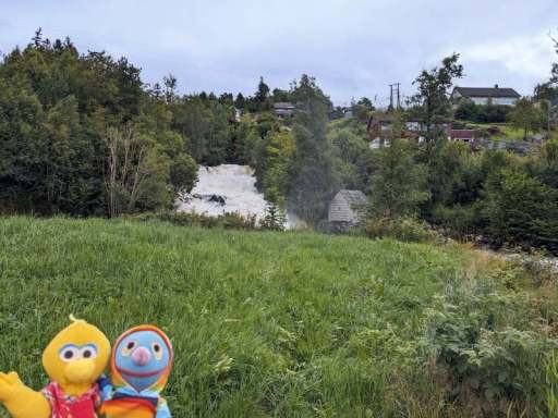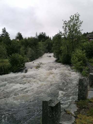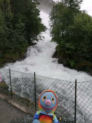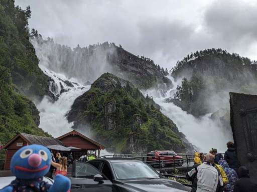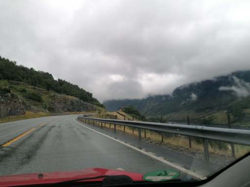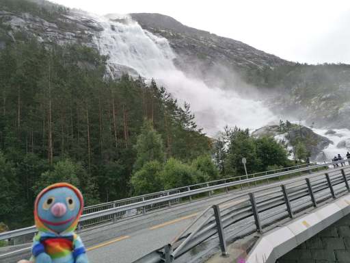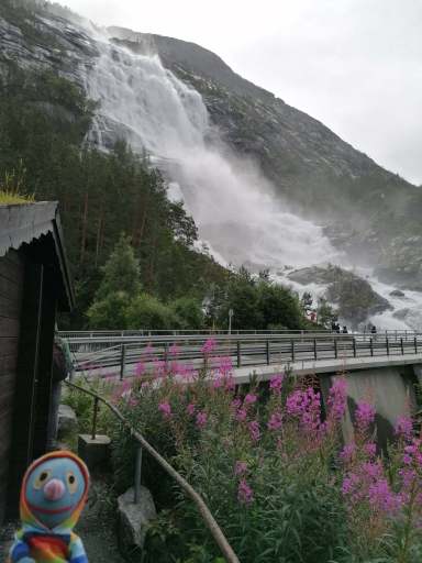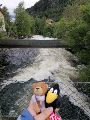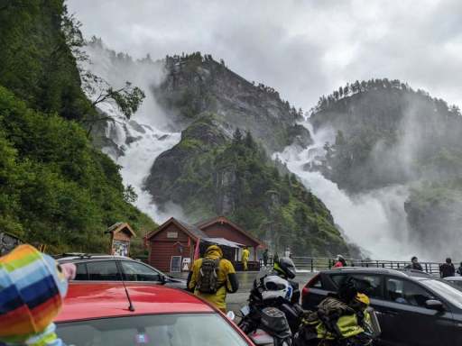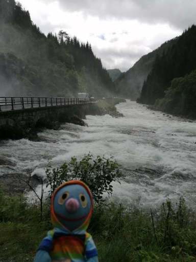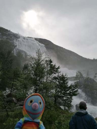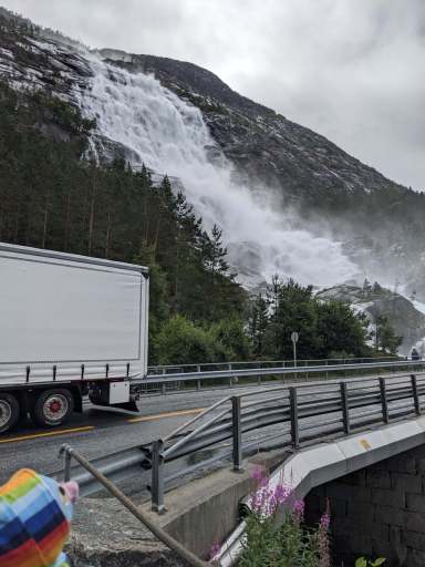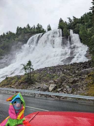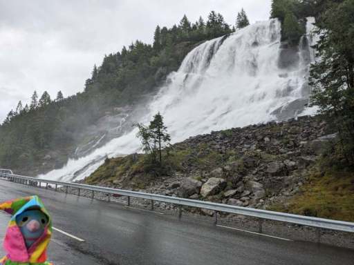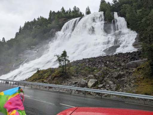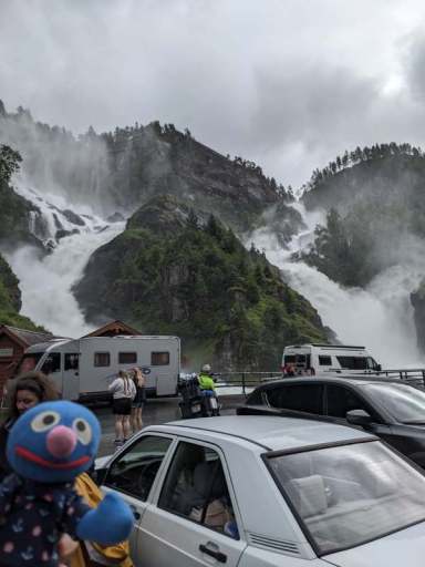 Am Nachmittag beschlossen wir, trotz des Wetters einen kleinen Ausflug zu einem Wasserfall zu machen. Wie sich herausstellte, waren die Straßen nach Herand gar nicht so übel, denn es ging noch deutlich schlimmer. In einer Baustelle neben einem neu entstehenden Tunnel, bestand die Straße überwiegend aus tiefen Schlaglöchern und alle Drängler Norwegens hatten sich hinter uns versammelt. Uff.