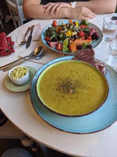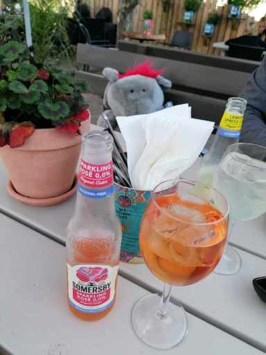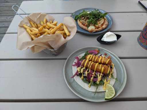 Zurück im Ort kehrten wir nahe der Strandpromenade in einen Biergarten ein, der eine perfekte Wahl war: Leckeres Essen, gute Musik und schöne Stimmung. Nur der Fanti wurde ein wenig verwundert beäugt.