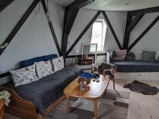 Heute morgen war uns das Wetter fast egal, denn es hieß Abschied nehmen. Und zwar nicht nur von der Mühle, sondern von Schweden an sich. Nachdem wir alles gepackt und im Auto verstaut hatten, mussten wir noch ein bisschen putzen und natürlich Fotos machen. Der Grundriss der Mühle war folgendermaßen: Im Erdgeschoss waren Küche und Bad, im 1. Stock das Wohnzimmer und ganz oben das Schlafzimmer.
