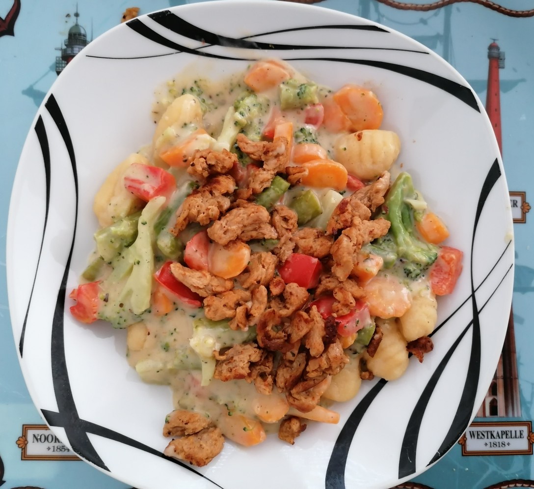 Zutaten: 2 Karotten1/2 halbe rote Paprika 3-4 Stängel grüner Spargel (vorgekocht)1/2 kleiner Brokkoli in Röschen (vorgekocht)Pflanzenfett und Öl zum Braten1 EL MehlGemüsebrühe (vegan)1 Pkg. Gnocchi (vegan)1 Becher Kochsahne (vegan)1 kleine Schüssel ErbsenproteinGewürze nach Wahl Zubereitung: Karotten waschen, putzen, schälen und in etwa gleich große Scheiben schneidenPaprika waschen, putzen und in gleich große Stücke schneidenWeiteres Gemüse… Weiterlesen Gnocchi mit Gemüsesoße und „Hähnchenwürfeln“ (vegan)